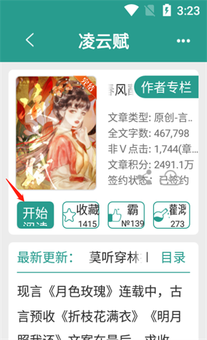 2、在这里找到你要下载的小说,然后点击进入小说作者专栏页面,点击开始阅读。