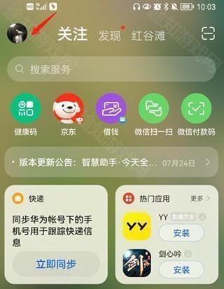 1、将手机左滑至搜索页面,点击右上角的头像。