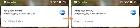 当屏幕上显示 Duo Push 通知时,轻触指示的位置以查看可用操作:批准或拒绝。