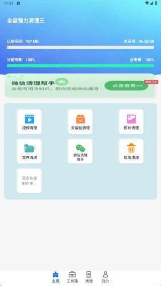 2、在工具箱页面,可更直观地了解各类文件占用的空间大小,分类细致,能快速查看。