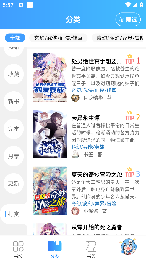 通过分类浏览(如奇幻、科幻、恋爱等)手动查找目标作品。