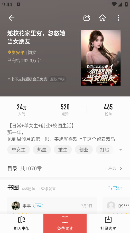 连阅免费小说是一款面向小说爱好者的免费阅读平台,覆盖玄幻、都市、言情、科幻、武侠等各类热门图书,满足用户多元化阅读需求。无论是玄幻修真还是都市职场,历史军事还是二次元同人,百万册小说可供挑选,冷门热门内容一应俱全。平台基于用户的阅读历史和偏好,借助大数据算法推送相似题材小说;同时支持字体大小、背景颜色、翻页效果等个性化设置,夜间模式能降低屏幕对眼睛的刺激,有效保护视力。此外,用户可在评论区、书友圈发表书评、分享阅读心得,甚至能直接进入作者页面交流创作灵感。平台还提供语音朗读功能,让用户解放双眼,适合通勤、运动等多种场景使用。