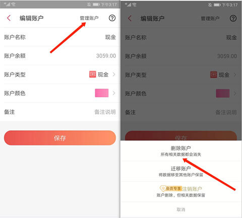4、进入账号编辑界面后,点击“管理账户”选项,接着选择“删除账户”功能。
