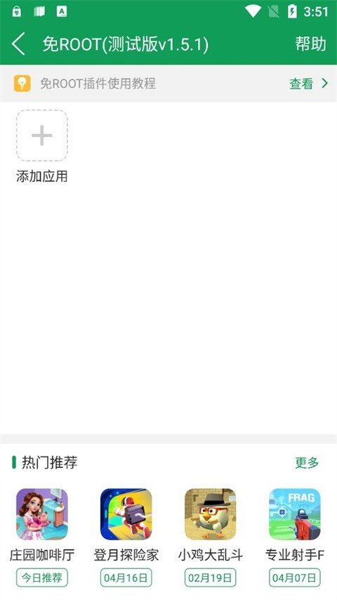 5、回到首页后,在免root功能板块里还能添加游戏或应用程序。