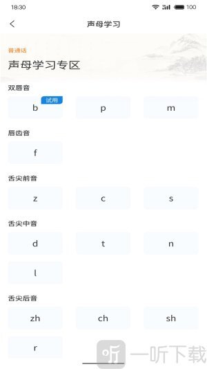 3.点击拼音学习,App提供声、韵、调三方面字词拼音学习及评测功能