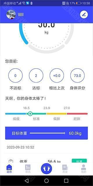4、然后进入到应用页面中就可以实时看到自己最近一次上秤时的体重数据