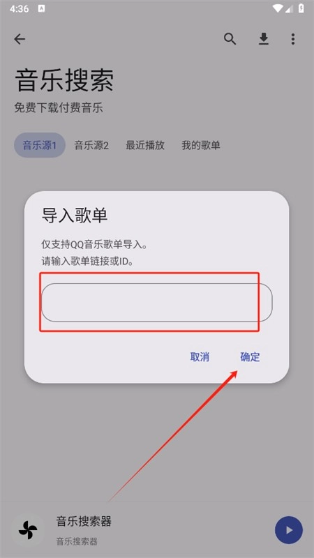 3、输入歌单链接或ID,点击确定即可导入