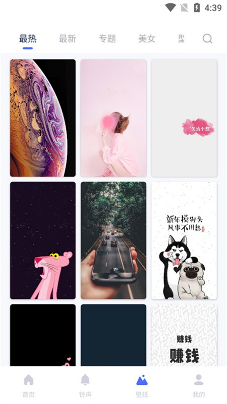 4、在“壁纸”中也是分为最新、最热、专题、美女等。