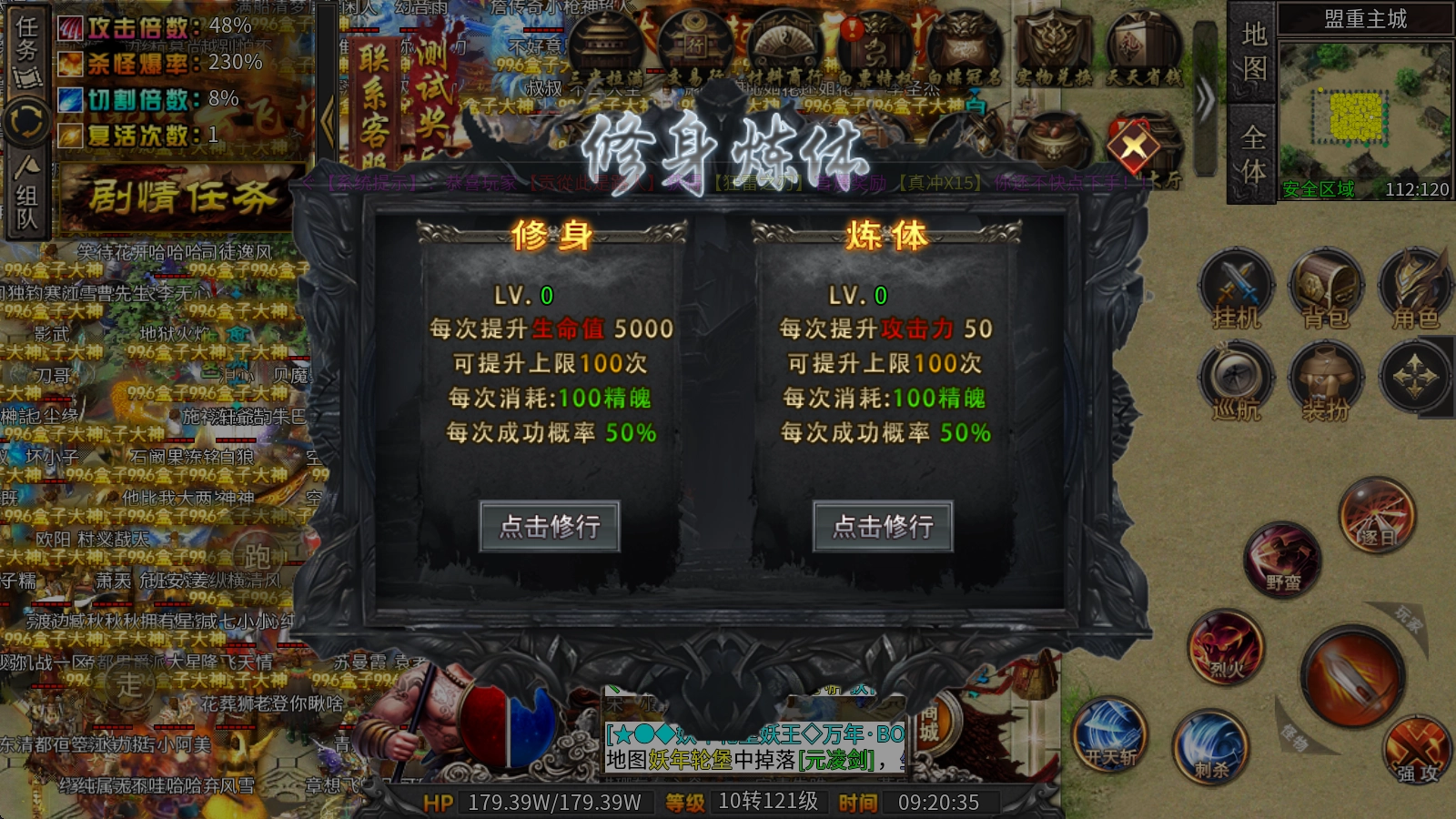 5、修身炼体:消耗精魄即可选择修身或者炼体,分别提升人物生命值和攻击力。