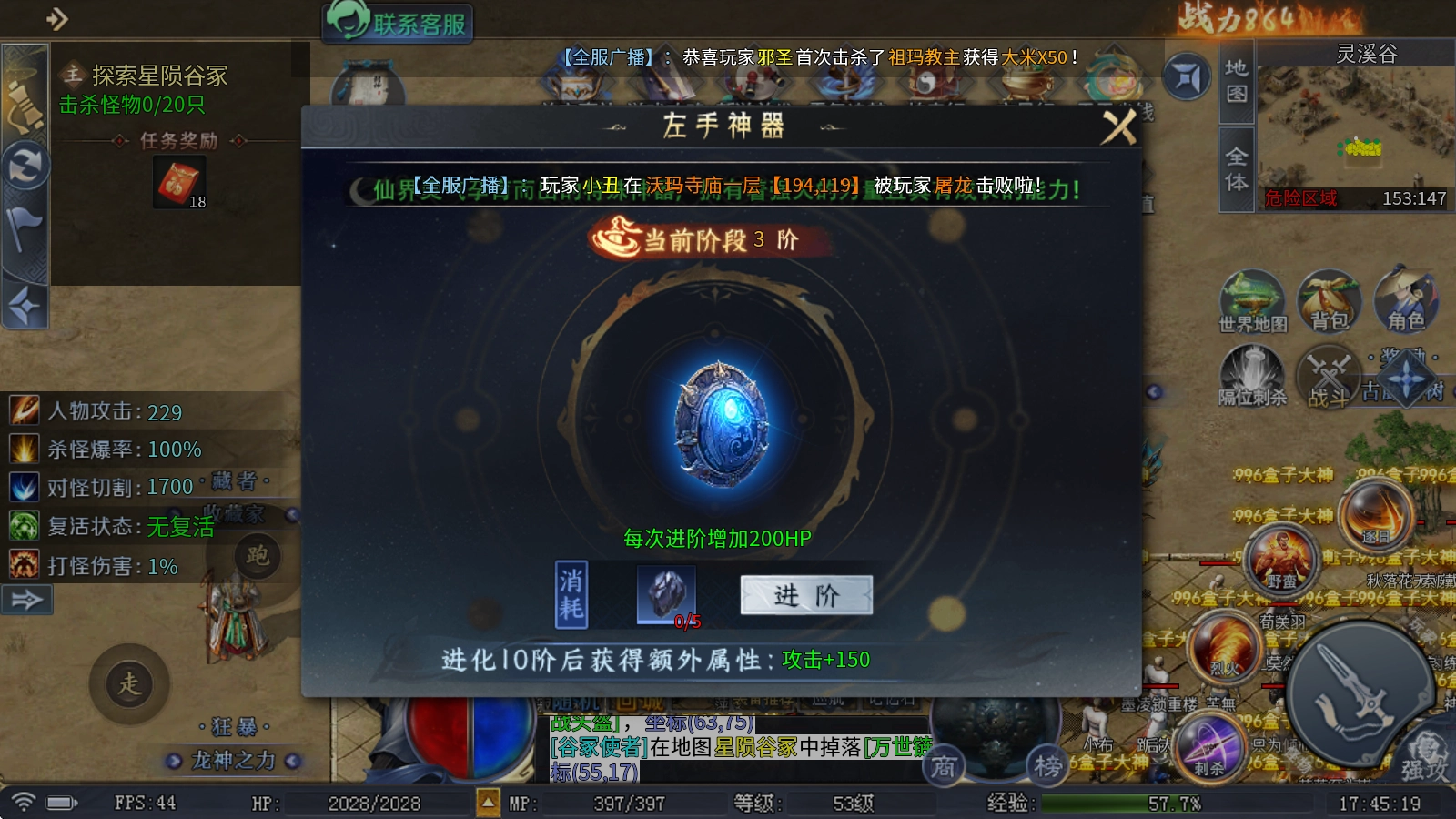 2、左手神器:只需消耗千年玄铁即可完成进阶,每次进阶都能提升200点HP属性,并且进化至10阶后还将解锁额外属性加成。