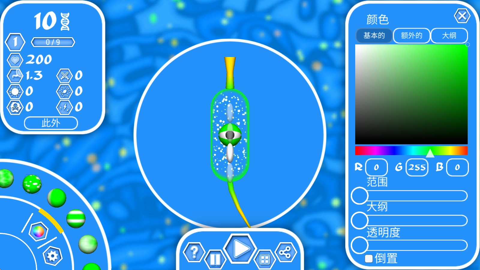 4、接下来就可以着手培养你的孢子了,在界面左上角能看到孢子的相关参数,点击孢子会弹出一个轮盘,通过这个轮盘可以调整孢子的长度与宽度。