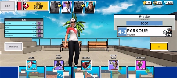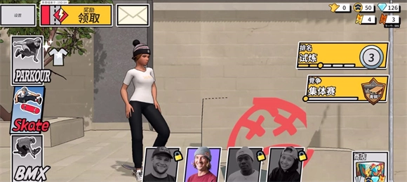 在主界面点击左侧按钮可切换不同游玩模式,当前共有三种,分别为跑酷、滑板和自行车。