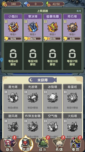 6、点击武器能够查看已解锁的炮塔,收集到一定数量的炮塔碎片后,还可以对炮塔进行升级操作。