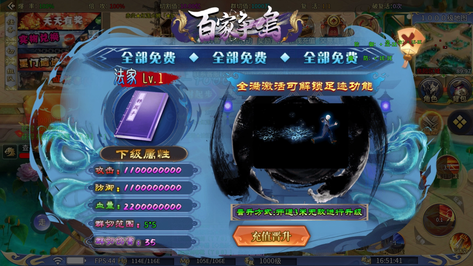 1、百家争鸣:通过杀怪方式即可提升,每一级提供高额属性以及群切范围和伤害,全满激活后可以解锁足迹功能。