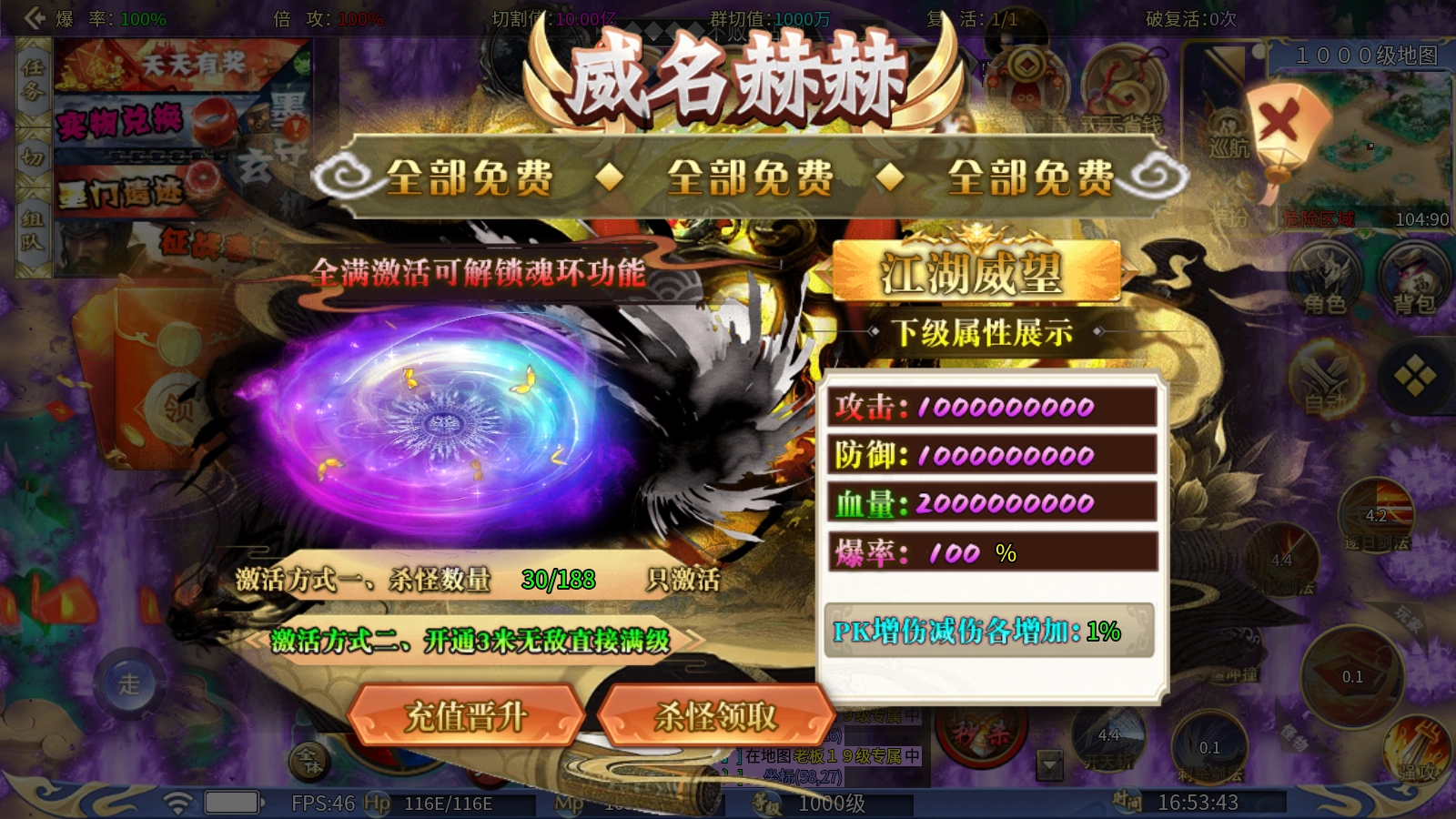 3、威名赫赫:通过击杀怪物就能提升等级,不仅能带来属性加成,还可增加角色的爆率以及PK时的增伤与减伤效果,当该系统完全升满后,就能解锁魂环功能。