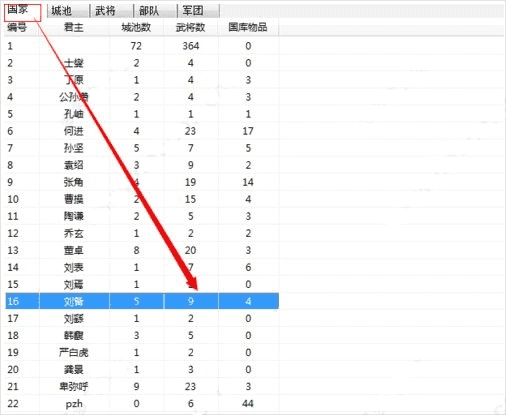 5、双击刘备条目可编辑国库物资,右键可更改君主归属及外交关系。