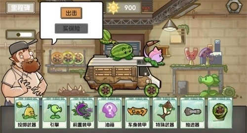 3、选好配件后,点击“出击”按钮就能开启闯关。另外,点击“买保险”可以让你在对局里获取更多阳光。