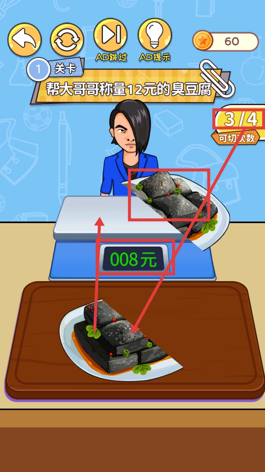 3、称量环节,需将臭豆腐切割后放置于秤上,同时留意【008元】的金额显示以及【3/4】的剩余可切次数,通过调整每次的切割量,确保最终达到目标金额。