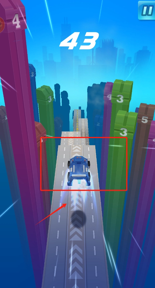 3、按住屏幕控制蓝色赛车加速,躲开障碍物,右上角暂停按钮可随时中断游戏。