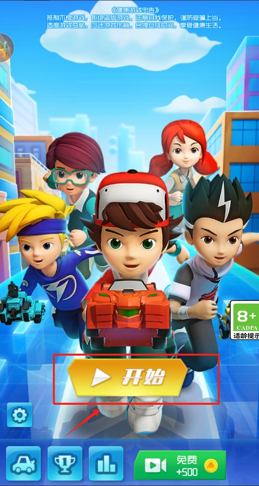 2、点右下角黄色开始按钮进入游戏,左上角红字是健康提示,免费+500是新手礼包。